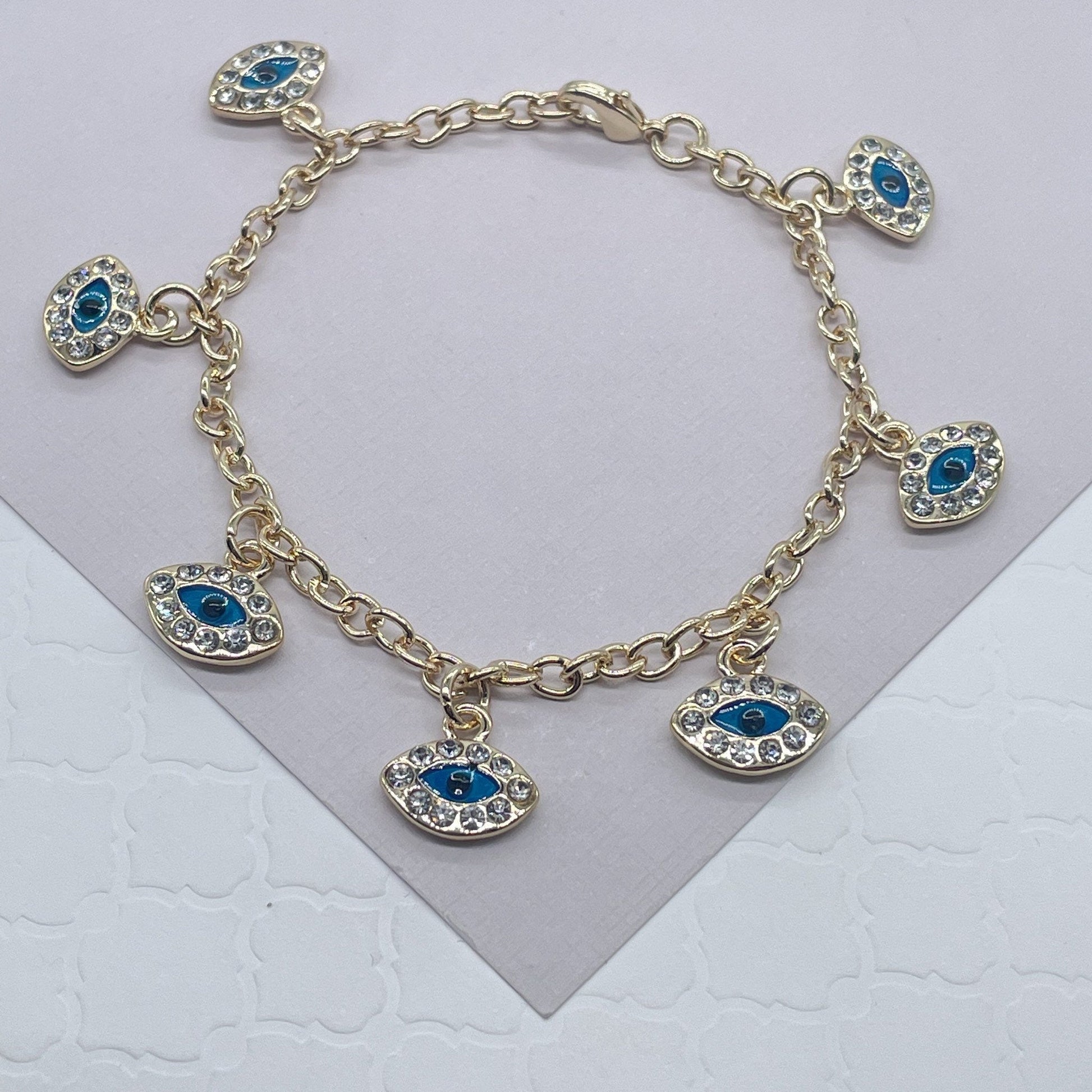 18k Gold Filled 7 Blue Evil Eyes and Zirconia Charm Bracelet
