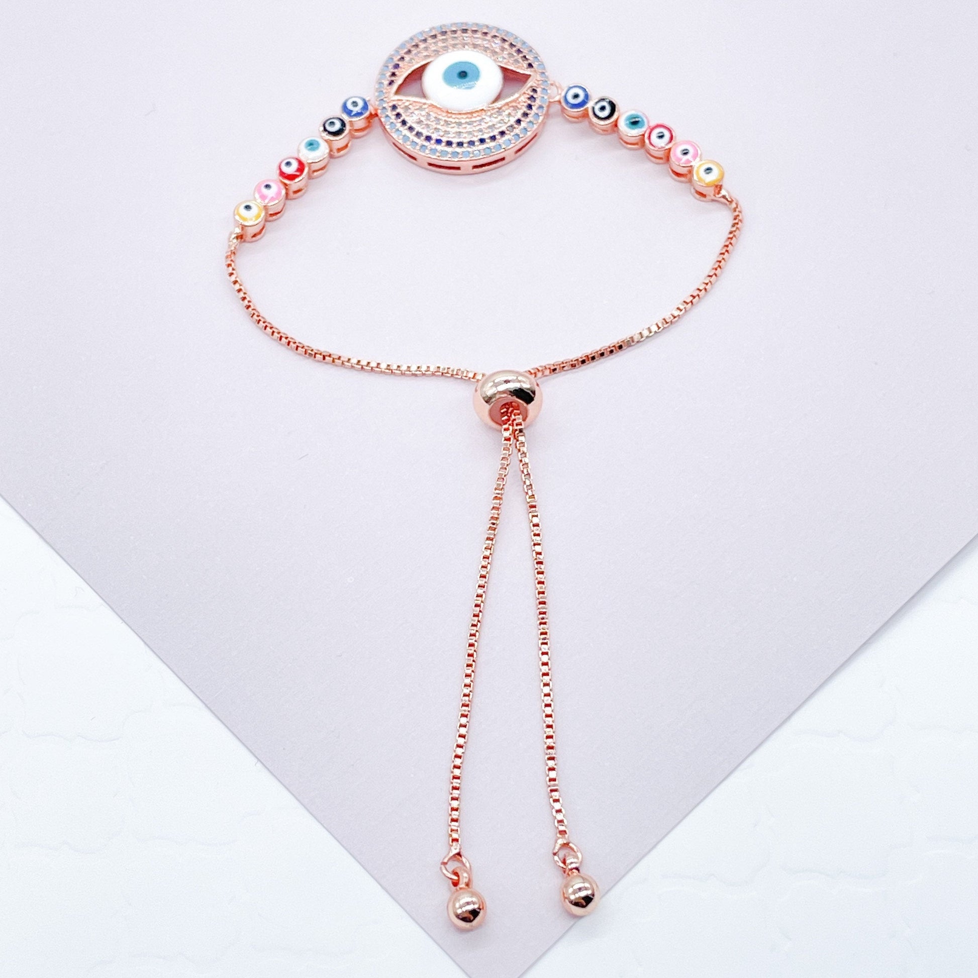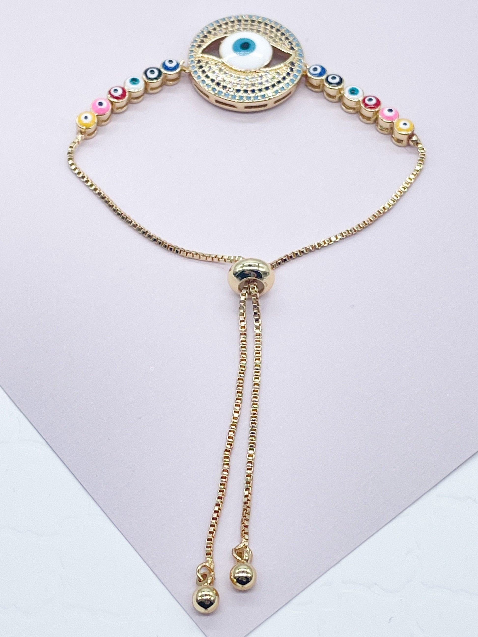 18k Gold Filled Adjustable Slide Clasp Greek Eye Bracelet Featuring Cubic