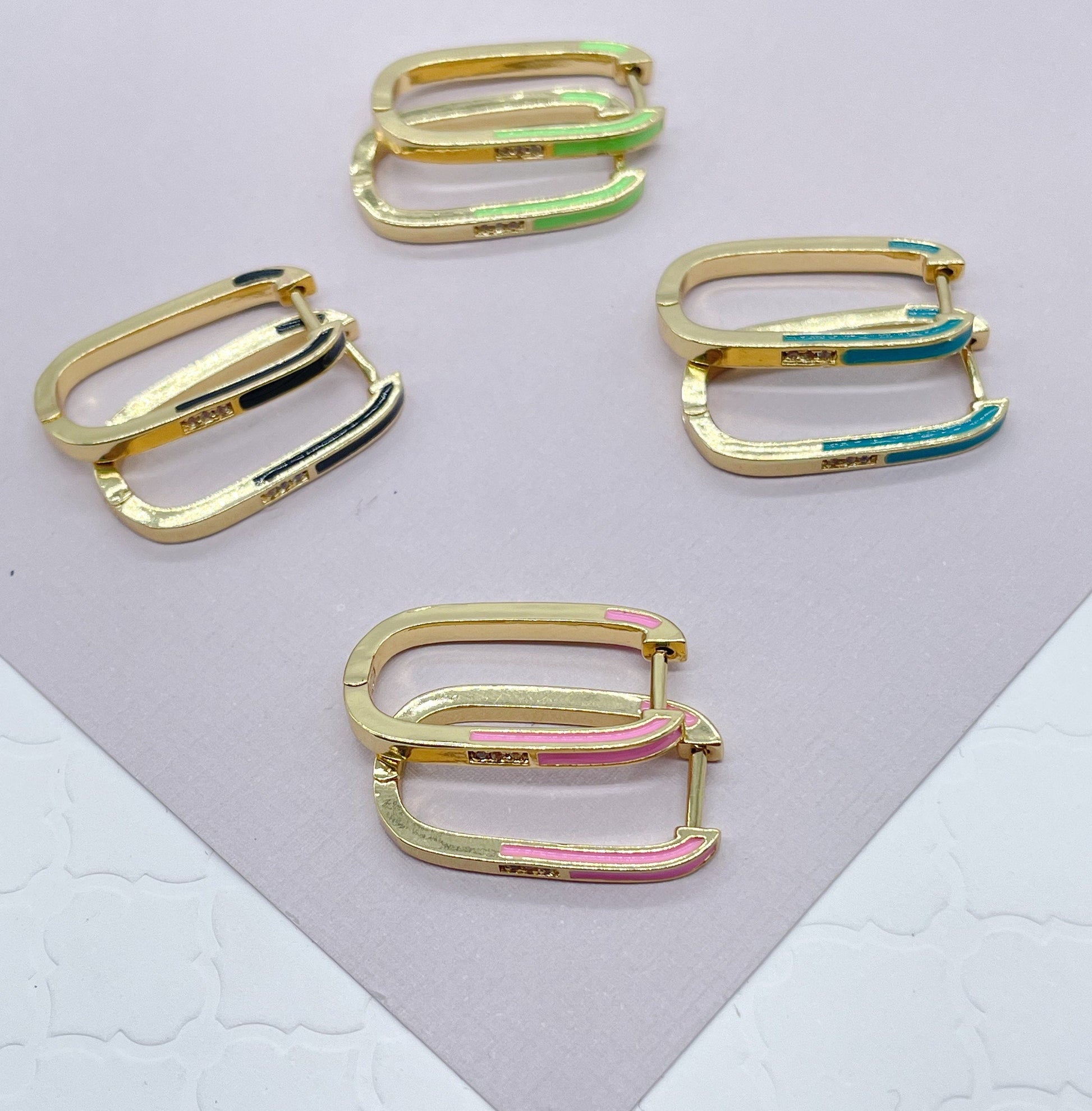18k Gold Filled Colorful Enamel Rectangular Hoop Our Etsy store was developed to help you find the most unique styles of modern designs, always looking for elegance and market trends. Here you will find ways to better make your jewelry through quality, seeking harmony, exclusivity and impeccable finish. Customer satisfaction is paramount to us. Images of enameled jewelry may differ to the naked eye. Please select carefully and feel free to ask before purchasing, we do not accept returns due to color taste.
