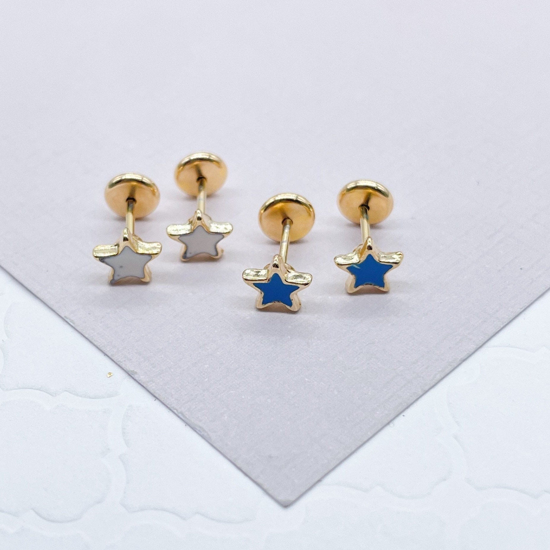 18k Gold Layered Colorful Stars Stud Earring White And Blue Patriotic Jewelry