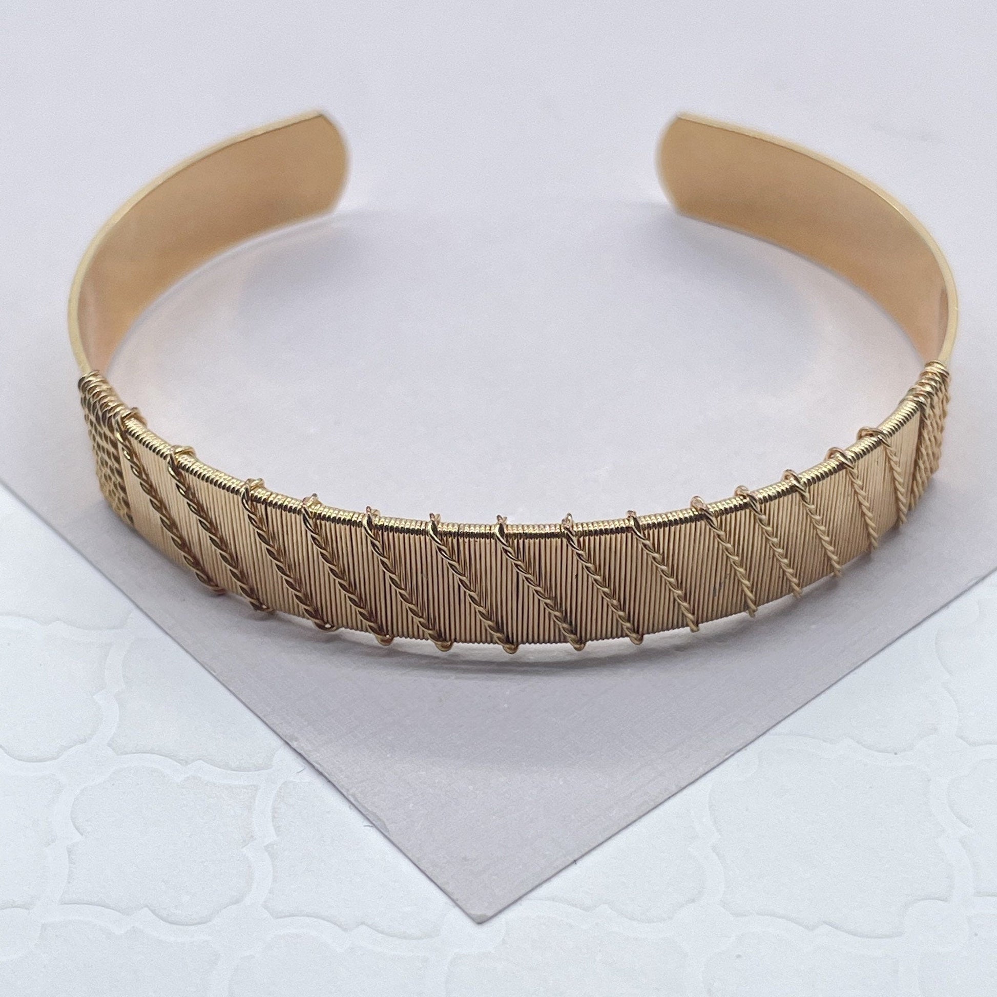 18k Gold Layered Flat Plain Cuff Bracelet Wrapped With Gold Thread, Gold
