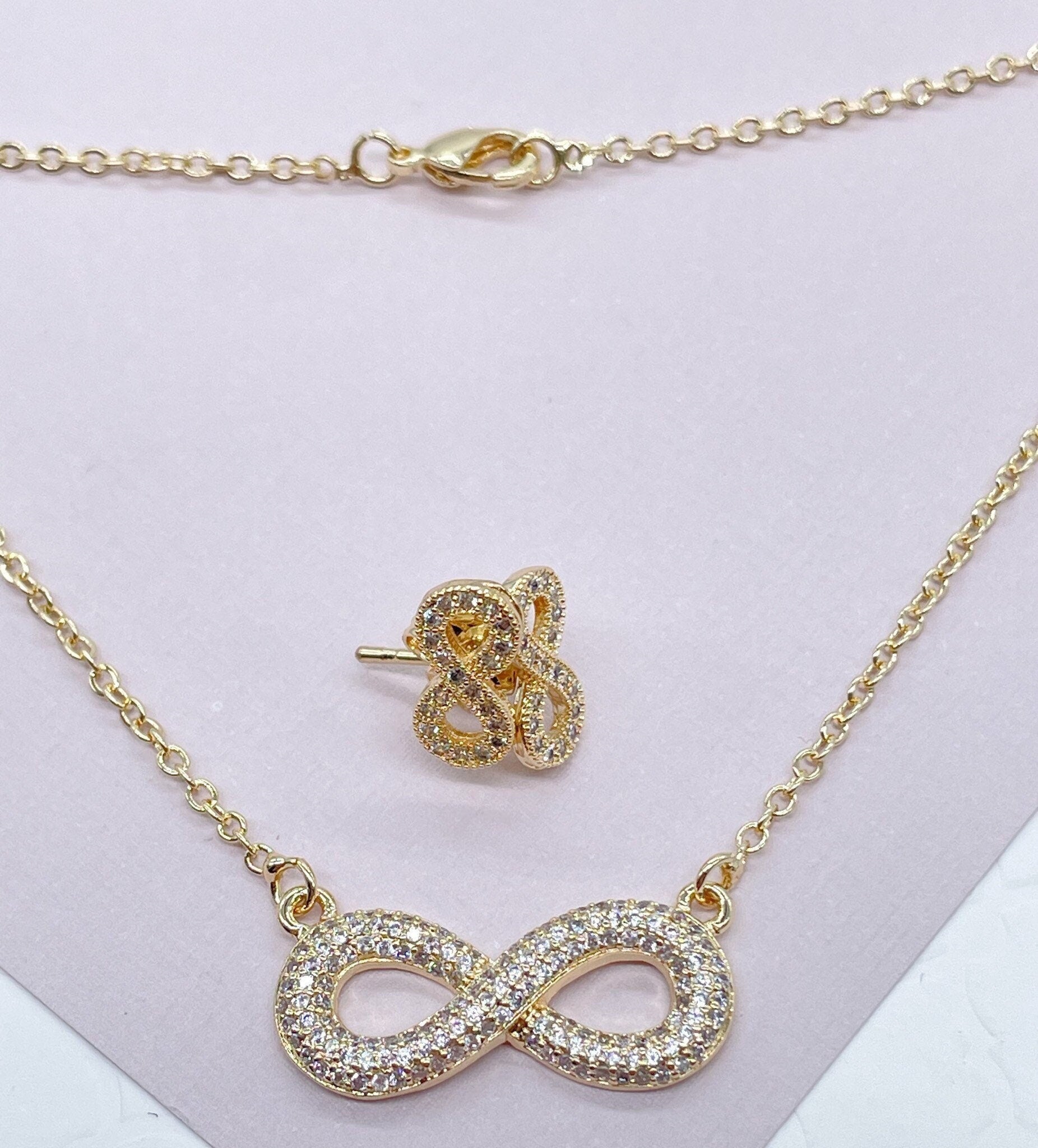 18k Gold Layered Puffy Infinity Set In Micro Pave Cubic Zirconia Necklace and