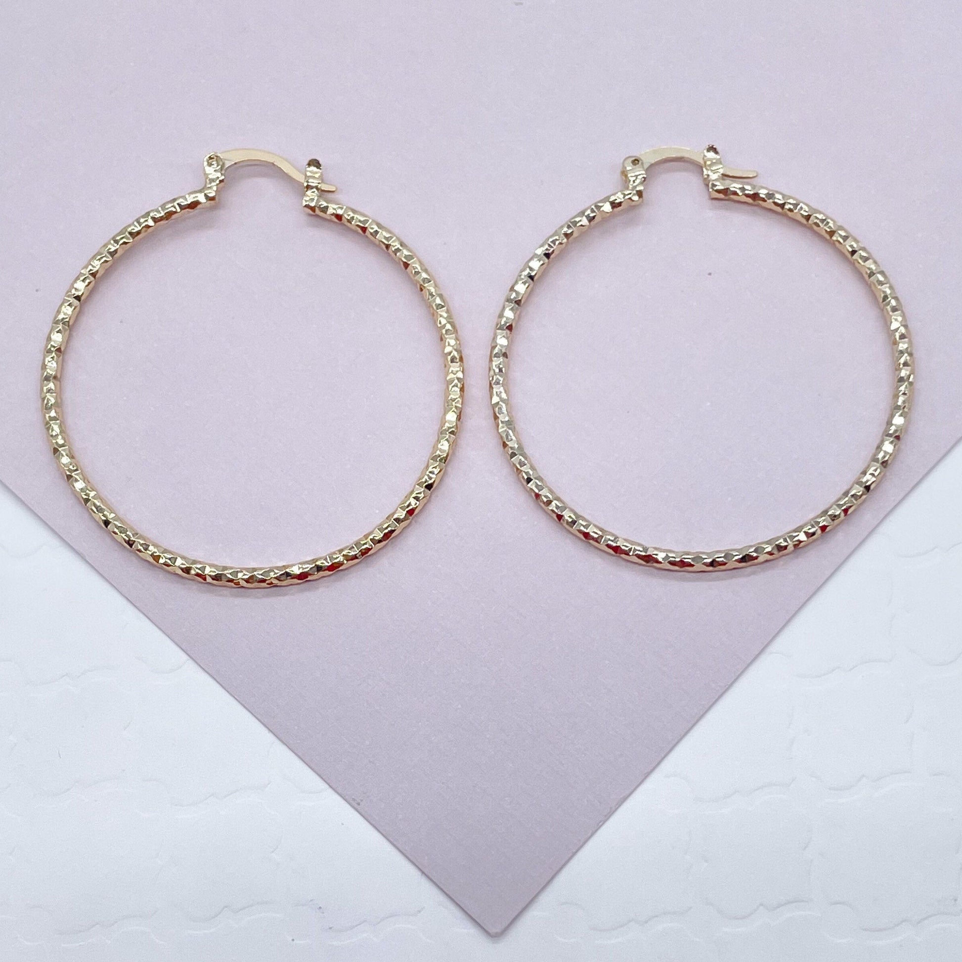 18k Gold Layered Rugged Diamond Cut Textured Hoop Earrings Medium Sized 43 mm