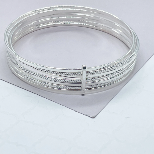 Silver Bangle Bracelet With Smooth and Textured Thin Layers- Nickel Free