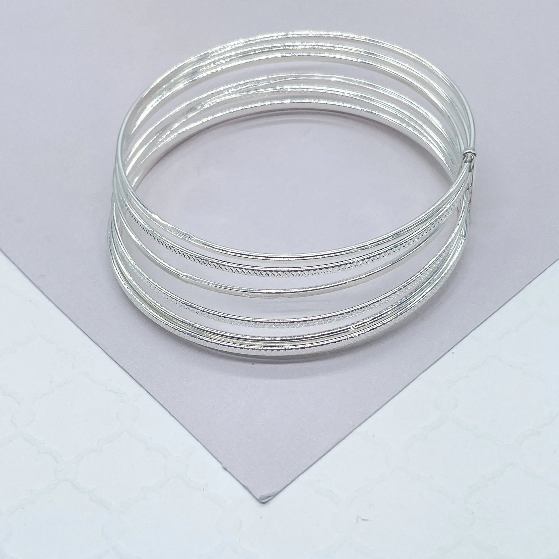 18k Silver Layered Silver Bangle Bracelet With Smooth and Textured Thin Layers