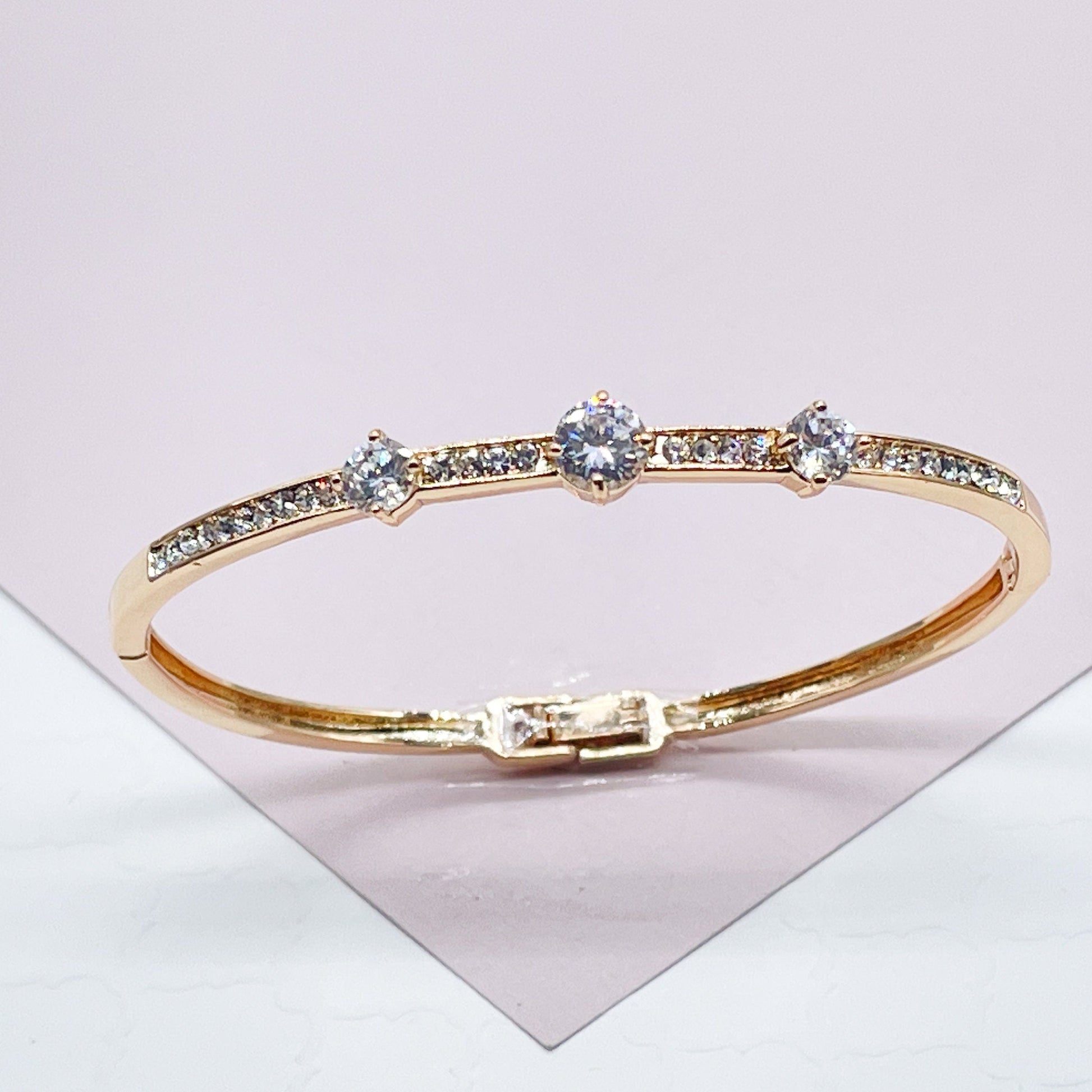 Hypoallergenic Gold Filled hinged safety clasp bangle with three large cubic zirconia on the top.